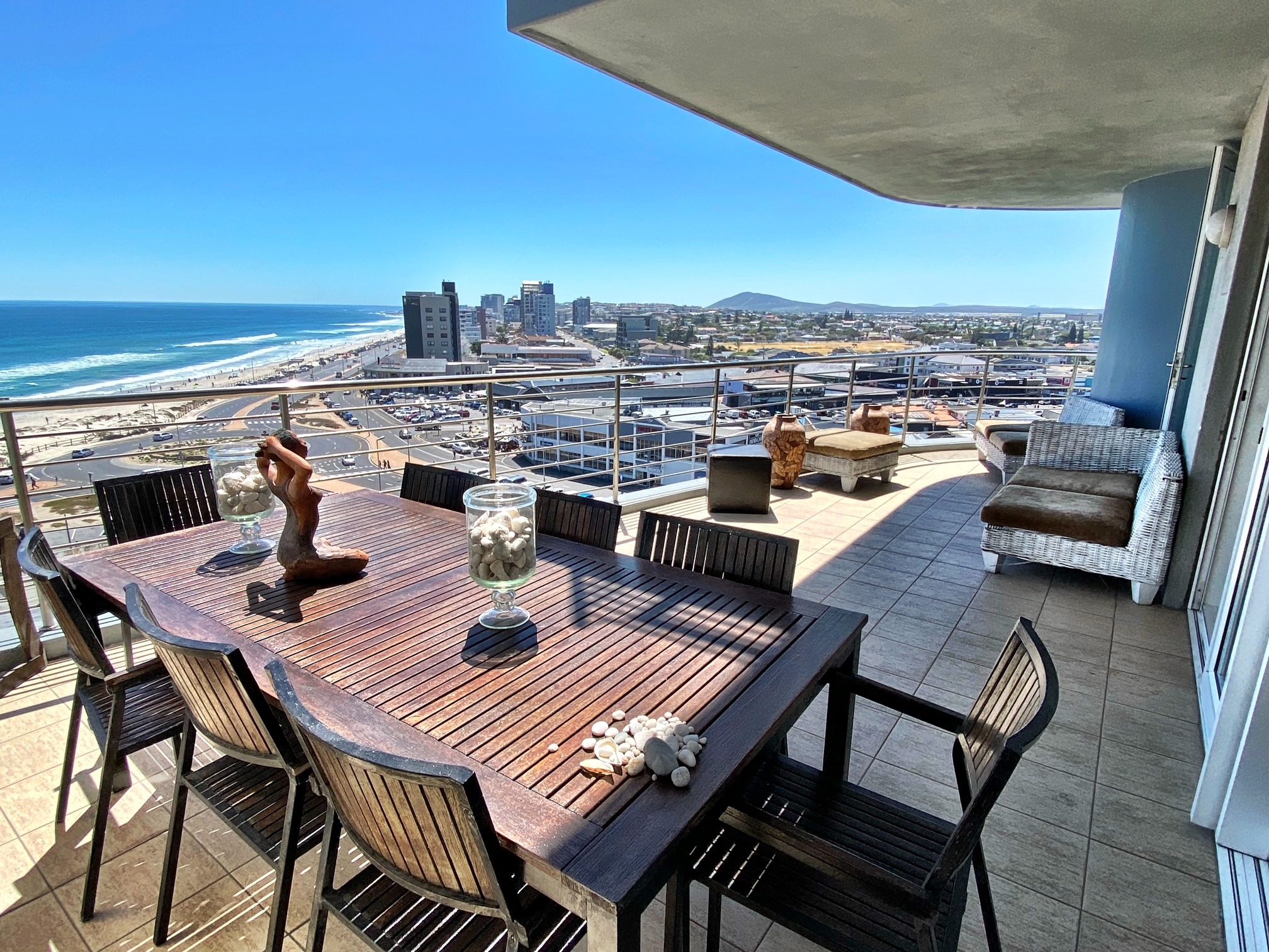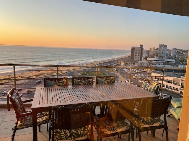 Balcony has 6 seater table and chairs, One outdoor sofa, 2 x loungers.